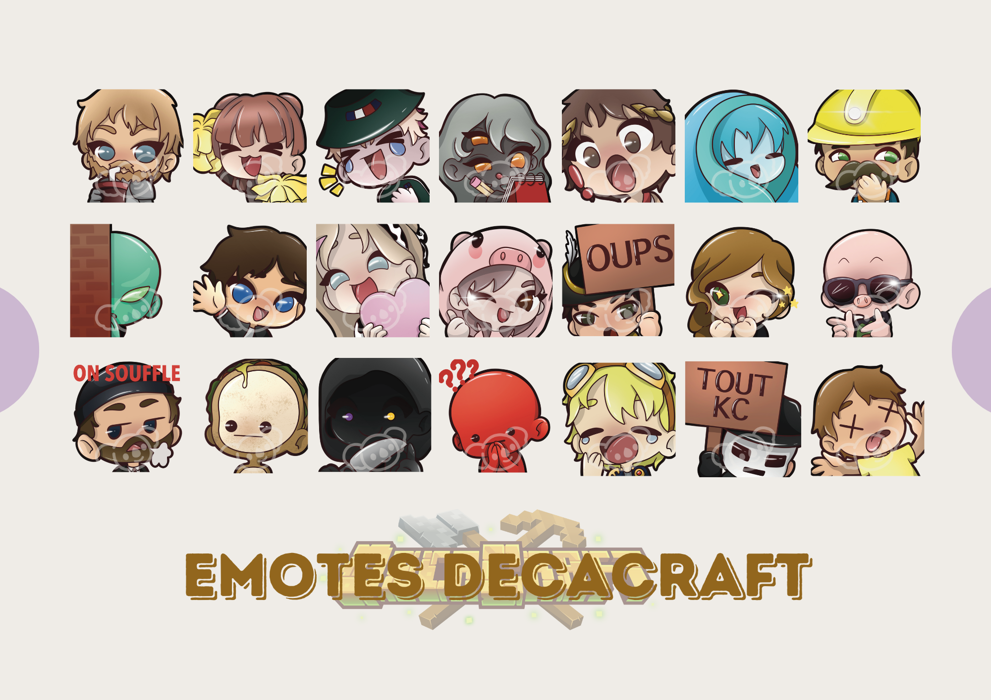 - Projet personnel, création d'emotes pour un serveur discord minecraft. Création originale en suivant des caractéristiques physique, de character design ou animales.